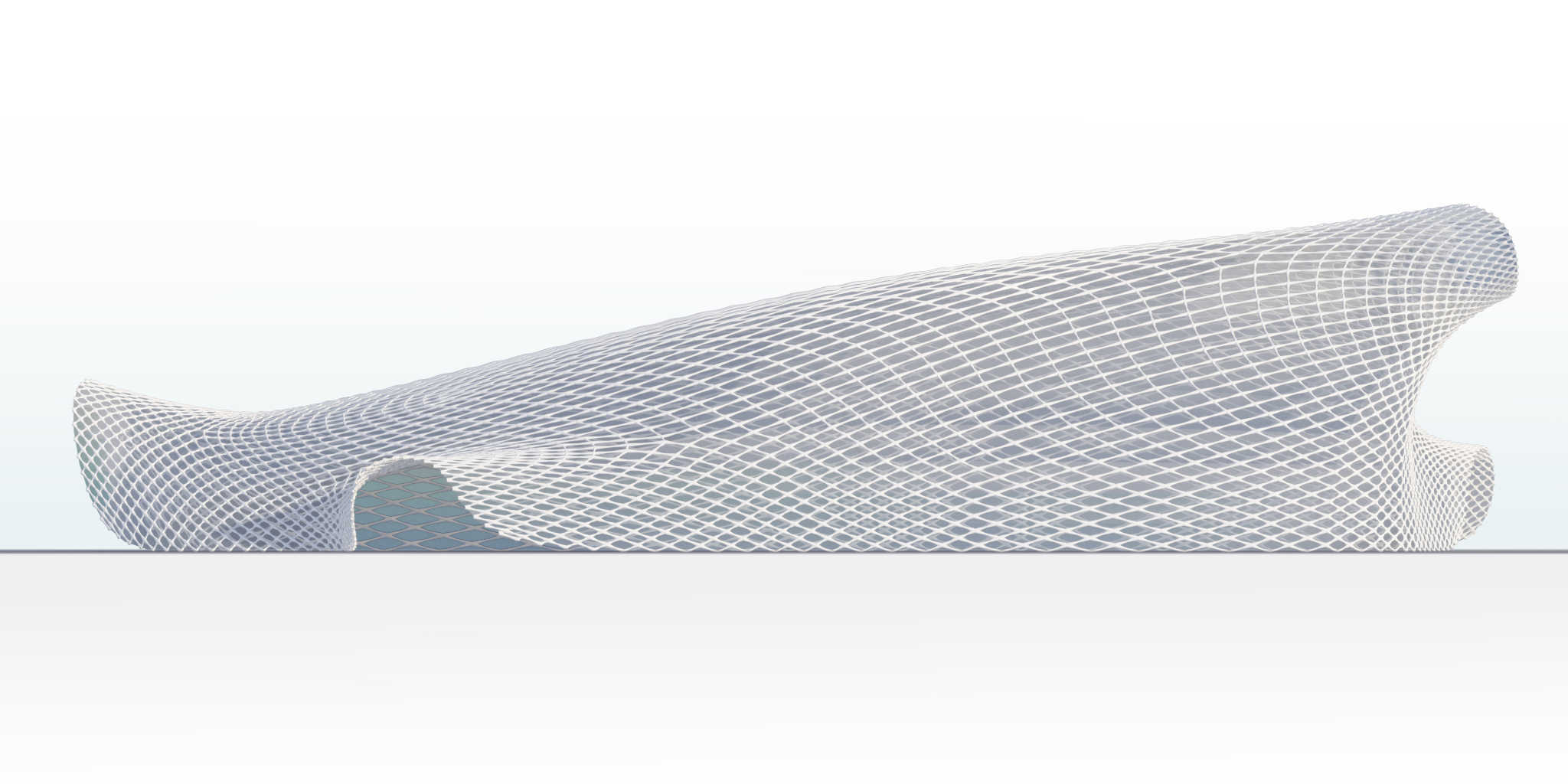 The fabric like gridshell allows strength in the weaving of pressurized tubes that expand a plastic film to form the programmatic spatial need. The pressurized tube grid transitions spacing by responding to the tension within the manipulated surface.